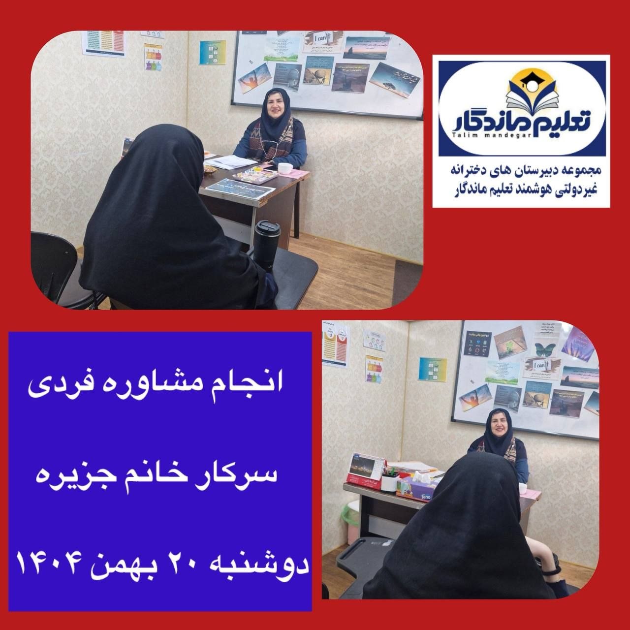 دبیرستان تعلیم ماندگار در آغاز ترم دوم، با هدف ارتقای کیفیت آموزشی و حمایت همهجانبه از دانشآموزان، خدمات مشاورهای ویژهای را ارائه میدهد. این خدمات با رویکردی علمی و تربیتی طراحی شدهاند تا دانشآموزان بتوانند مسیر تحصیلی خود را با برنامهریزی دقیقتر و آرامش بیشتری ادامه دهند.